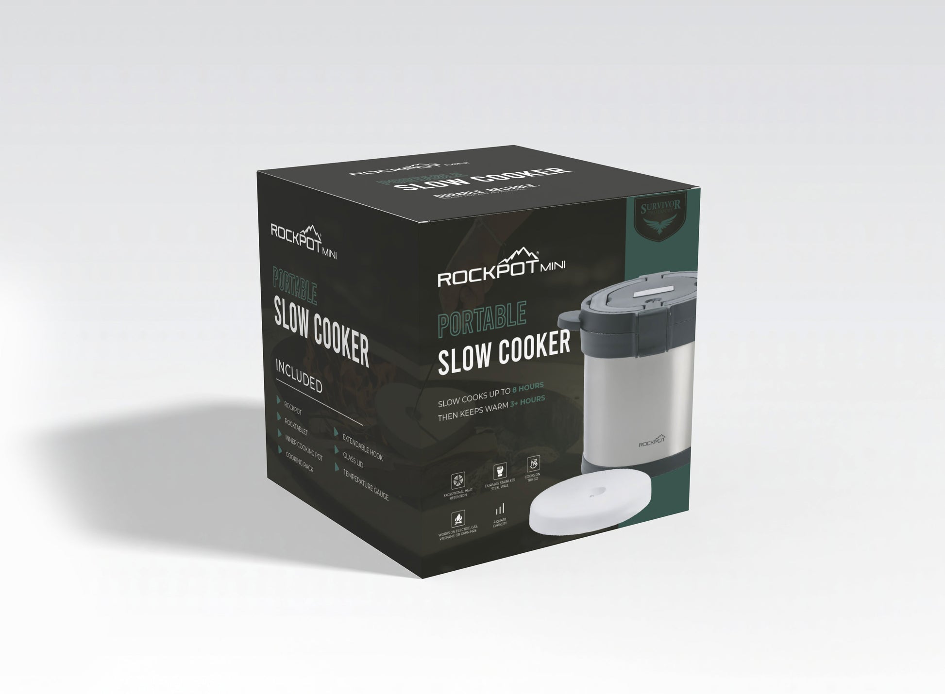 The RockPot Mini is an easy-to-use portable cooker that requires no propane or electricity that can cook raw food. It is perfect for feeding 1-3 people. The RockTablet is our stone-based heating source for Rockpot and can be heated over an open fire or over a stovetop (gas, electric, glass or butane) and can be reheated over 1,500+ times.